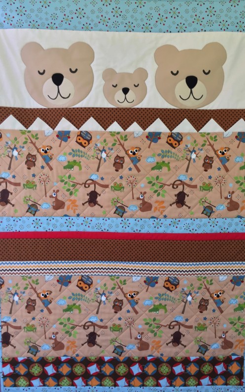I have just finished my third new baby quilt in a row! This is a large, cot quilt or playmat. It definitely has an Aussie feel to it with the feature fabric (which is on the back as well) showing kangaroos, koalas, kookaburras and crocs. The row of 3-D triangles at the top of the ‘bedding’ gives something for the child to fiddle with. Faces of bears are drawn on to avoid any hazard. It is 100% cotton.