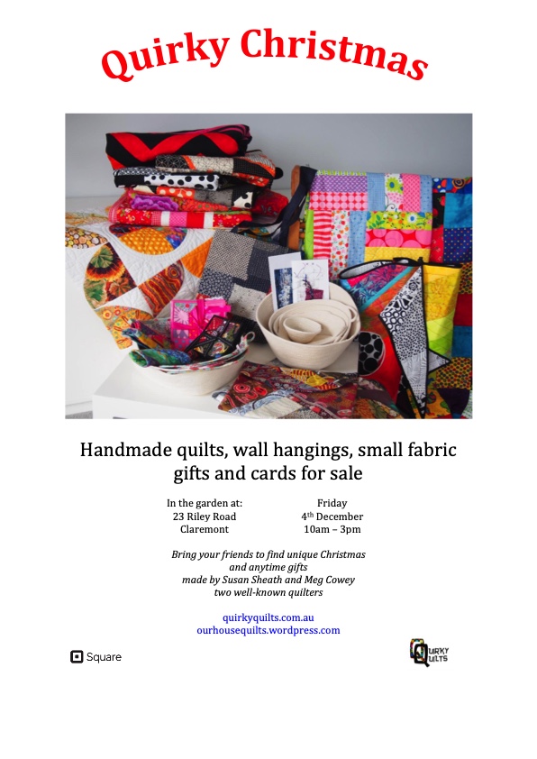 Remember that it is my quilt sale on Friday. Lots of quilts, wallhangings and gifts will be available for purchase. Meg Cowey of Our House Quilts will be joining me for this sale – her quilts are very different from mine! You’ll have to come along to see what I mean. The weather is set fine and the sale will be at 23 Riley Road, Claremont, WA on Friday, 4th December 10am-3pm.