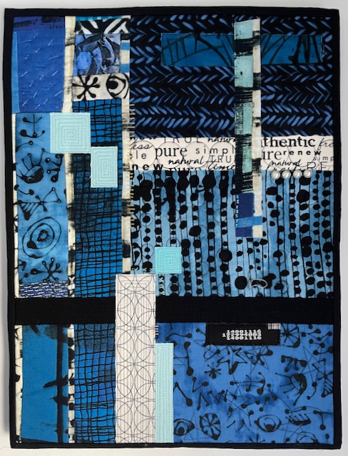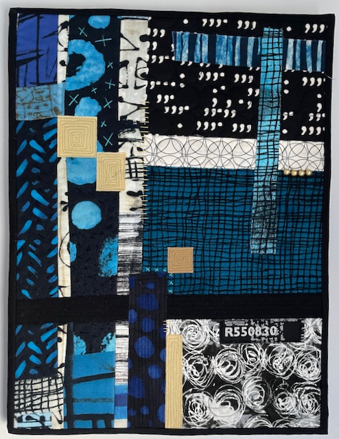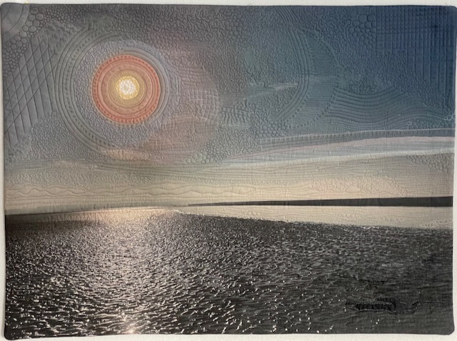 I thought I’d share with you some of my personal work. This is a photograph of Morecombe Bay in the UK, taken on a stormy morning which I had printed on fabric at Spoonflower. I then added layers of fabric and organza underneath and on top and quilted it in a manner which extenuated the falling of the light.
